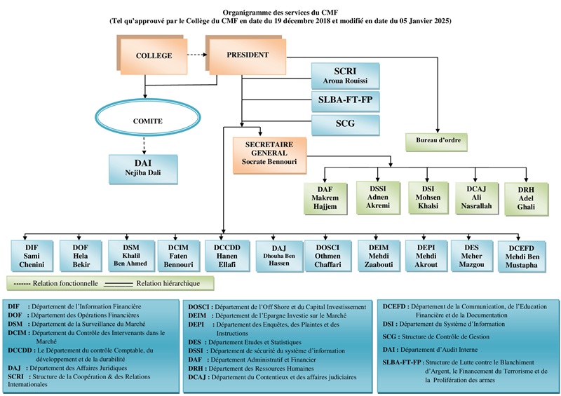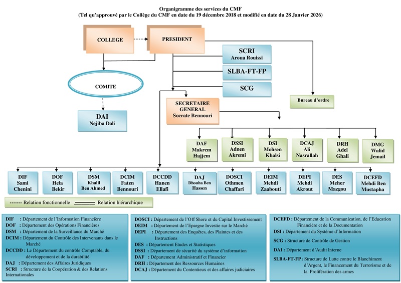 Le Président du CMF, assisté par le Secrétaire Général, assure l’organisation et la gestion des services administratifs et techniques.
