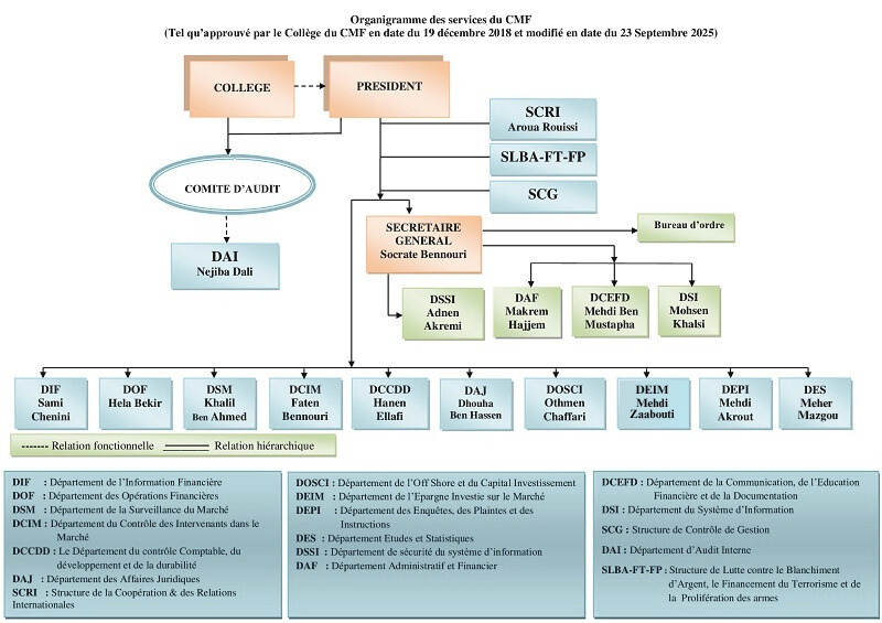 Le Président du CMF, assisté par le Secrétaire Général, assure l’organisation et la gestion des services administratifs et techniques.